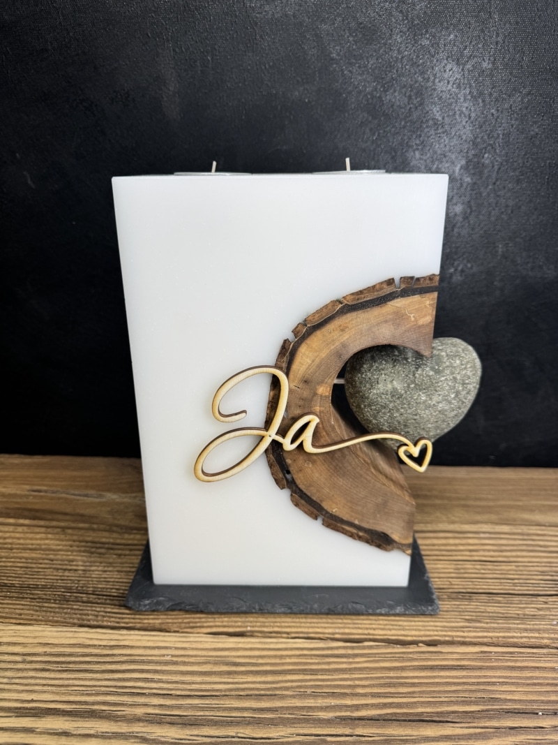 In das weiße Wachs der Kerze ist ein Holz mit herzförmigem Hohlraum eingegossen. An der Seite der Kerze ist ein Steinherz befestigt. Zudem ist in der Mitte ein ausgelasertes „Ja“ aus Holz angebracht.