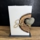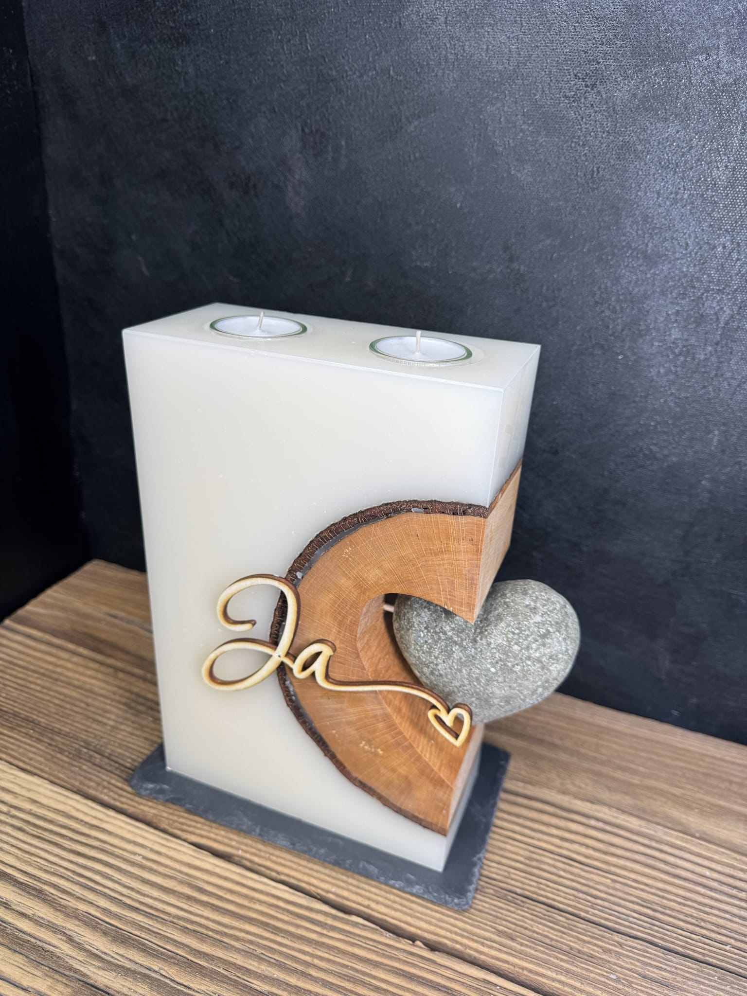 In das creme-weiße Wachs der Kerze ist ein Holz mit herzförmigem Hohlraum eingegossen. An der Seite der Kerze ist ein Steinherz befestigt. Zudem ist in der Mitte ein ausgelasertes „Ja“ aus Holz angebracht.