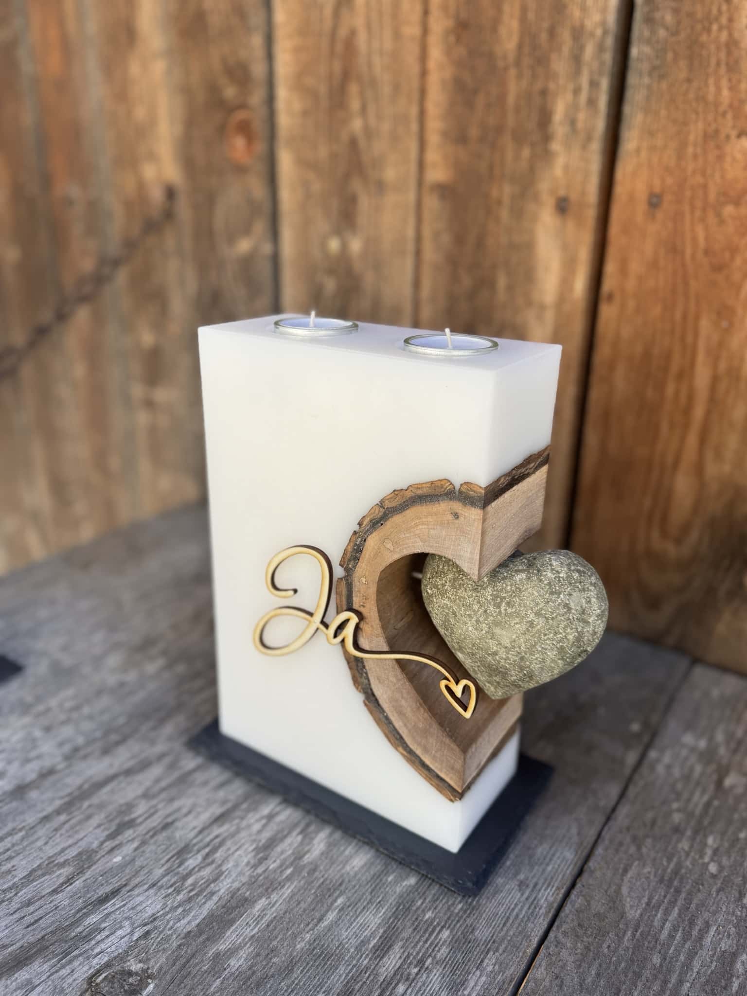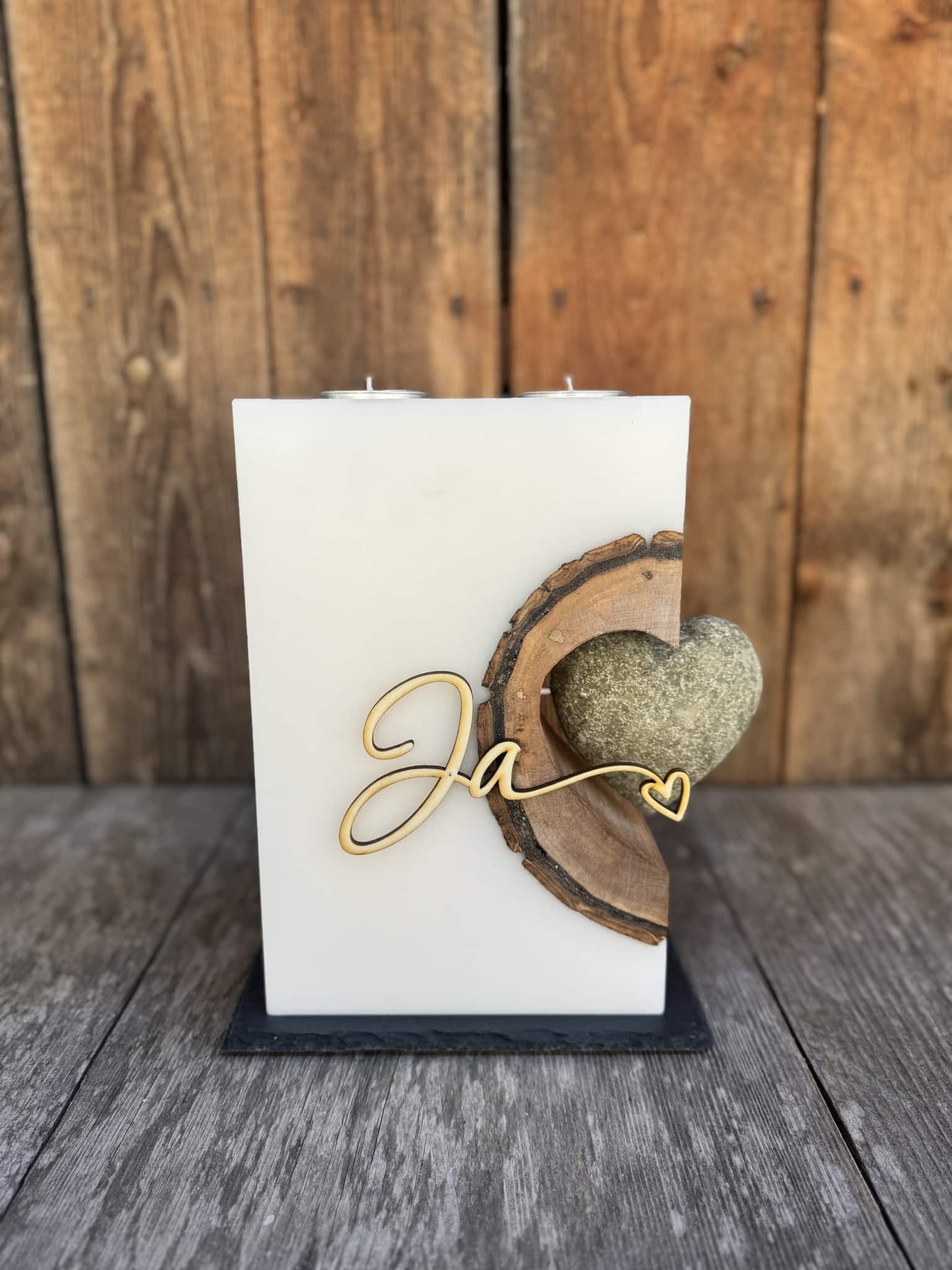 In das weiße Wachs der Kerze ist ein Holz mit herzförmigem Hohlraum eingegossen. An der Seite der Kerze ist ein Steinherz befestigt. Zudem ist in der Mitte ein ausgelasertes „Ja“ aus Holz angebracht.