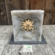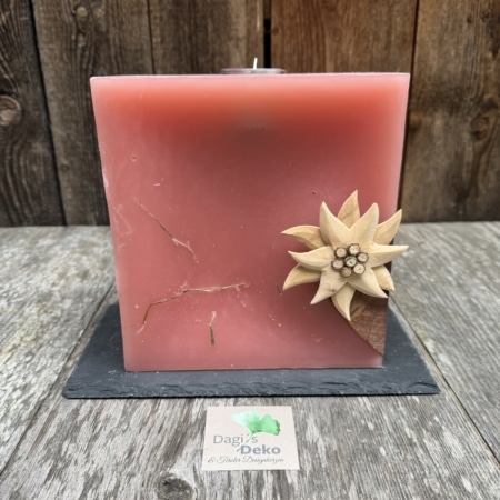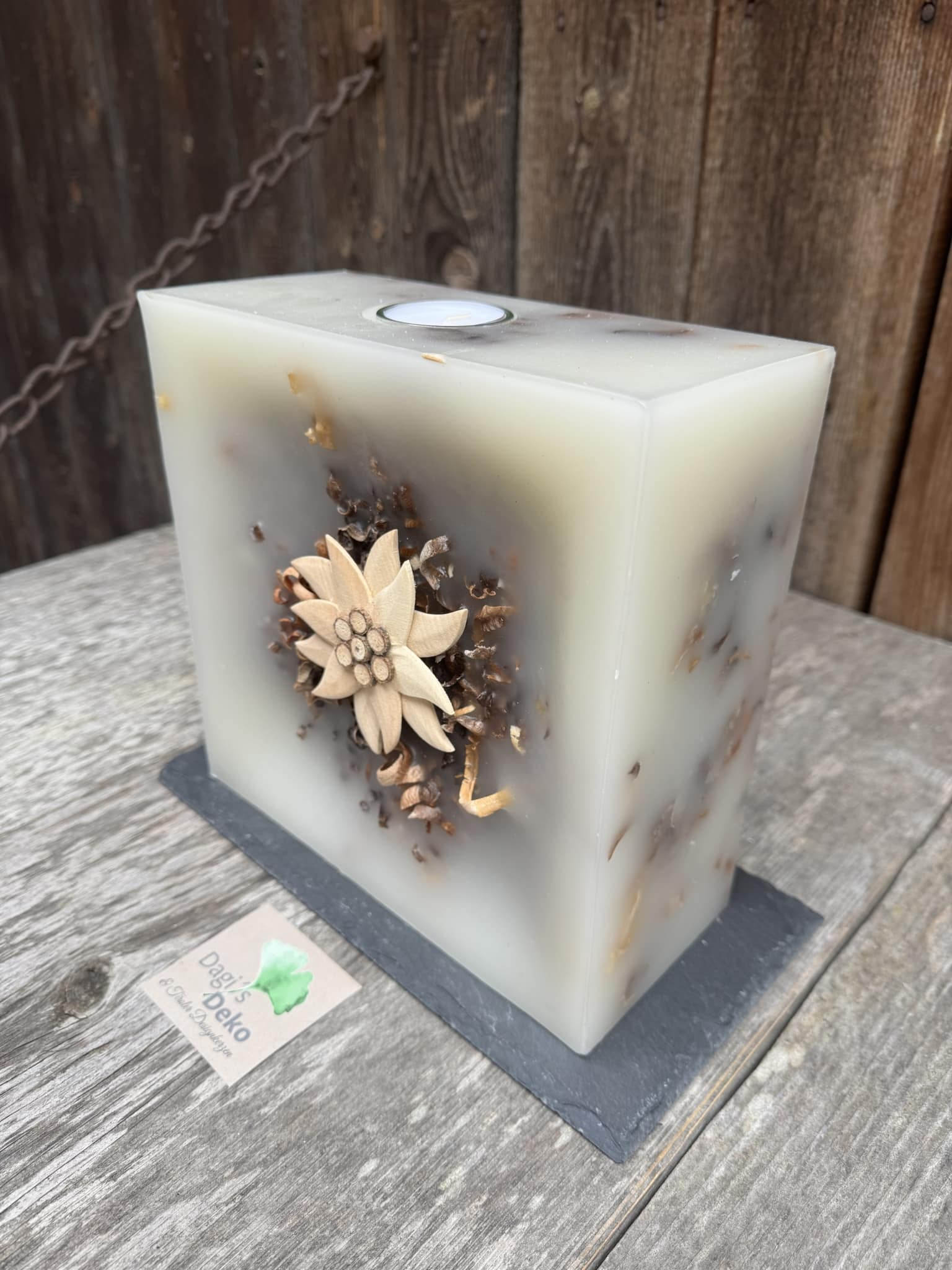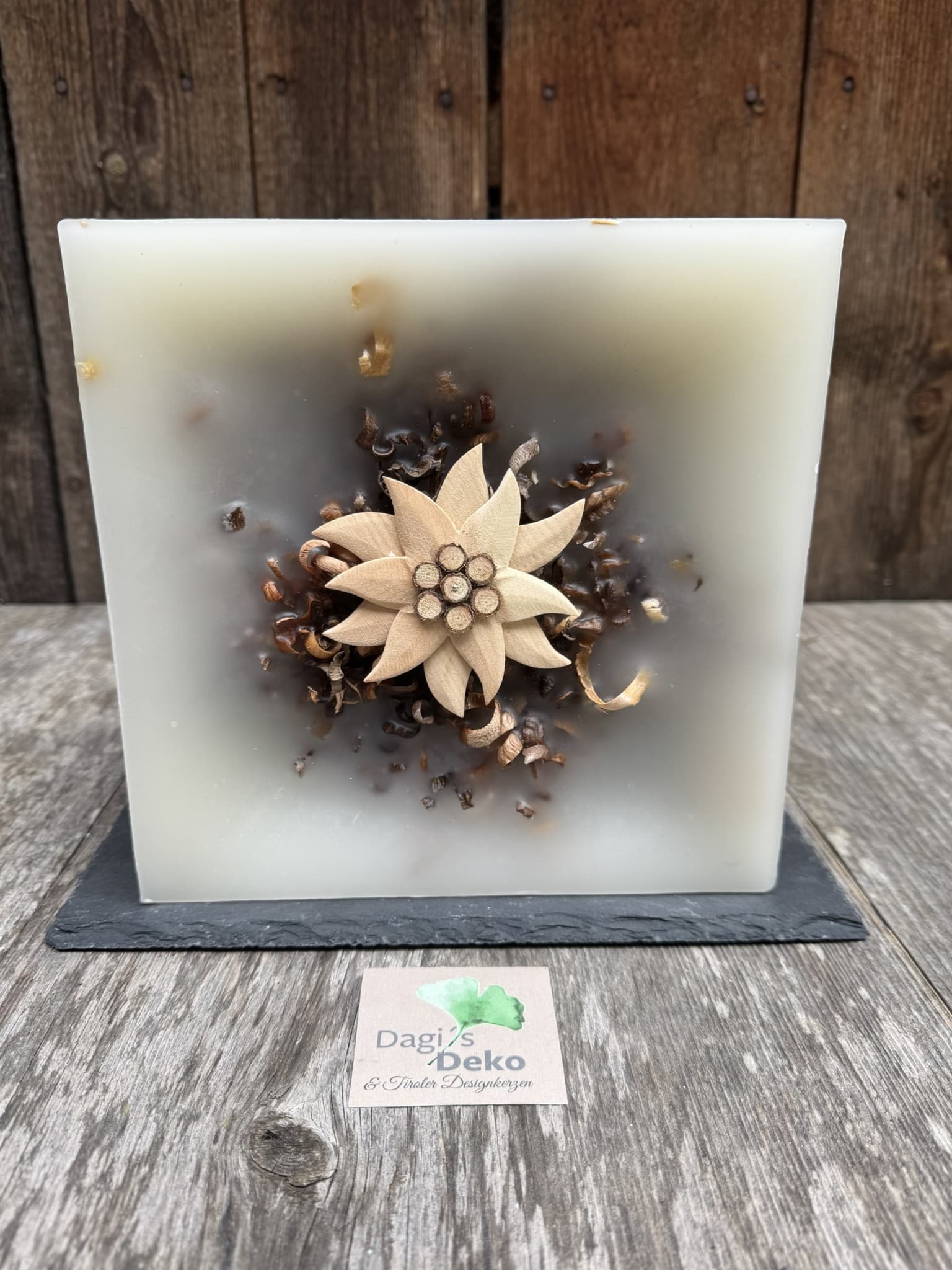 In das creme-beige Wachs der Kerze sind Holzspäne eingegossen. Zusätzlich befindet sich auf der Kerze eine handgeschnitzte Edelweiß.