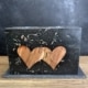In das schwarze Wachs der Kerze ist ein Holzherz eingearbeitet. Im Wachs sind auch Holzspäne eingegossen.