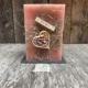 In das rosa Wachs der Kerze ist Heu eingegossen. Zusätzlich befindet sich auf der Kerze ein Herz mit verharzten Blüten und einem weiteren Holzherz darin.