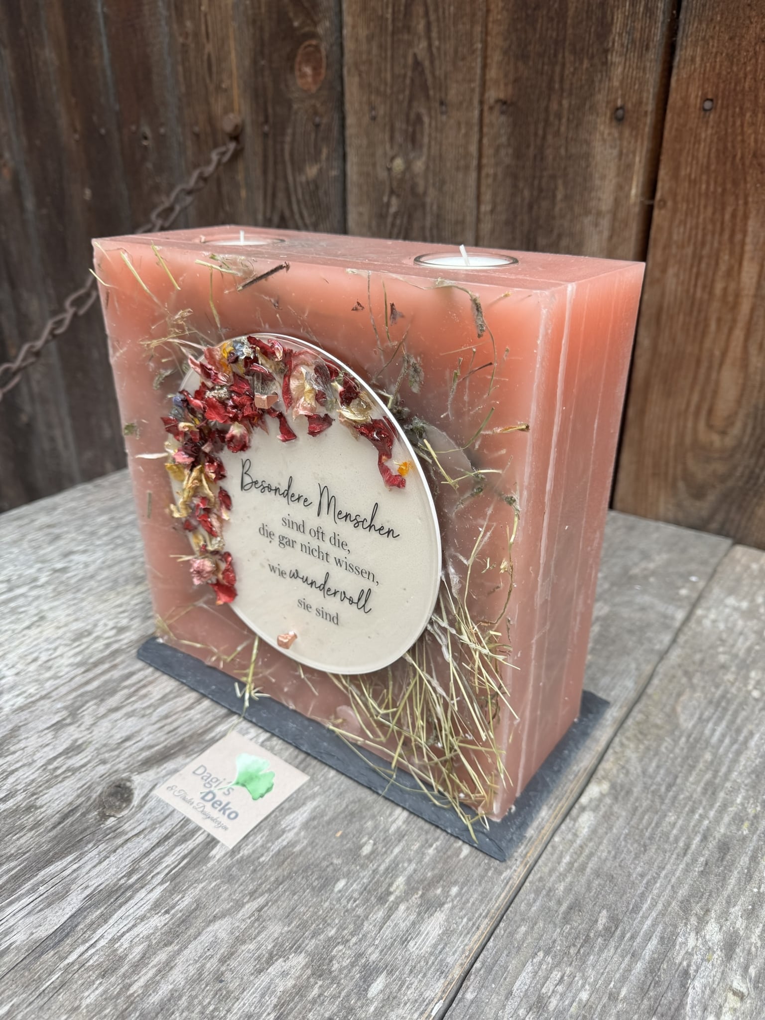 In das rosa Wachs der Kerze ist Heu eingegossen. Zusätzlich befindet sich auf der Kerze ein Schild mit verharzten Blumen und einem Spruch.