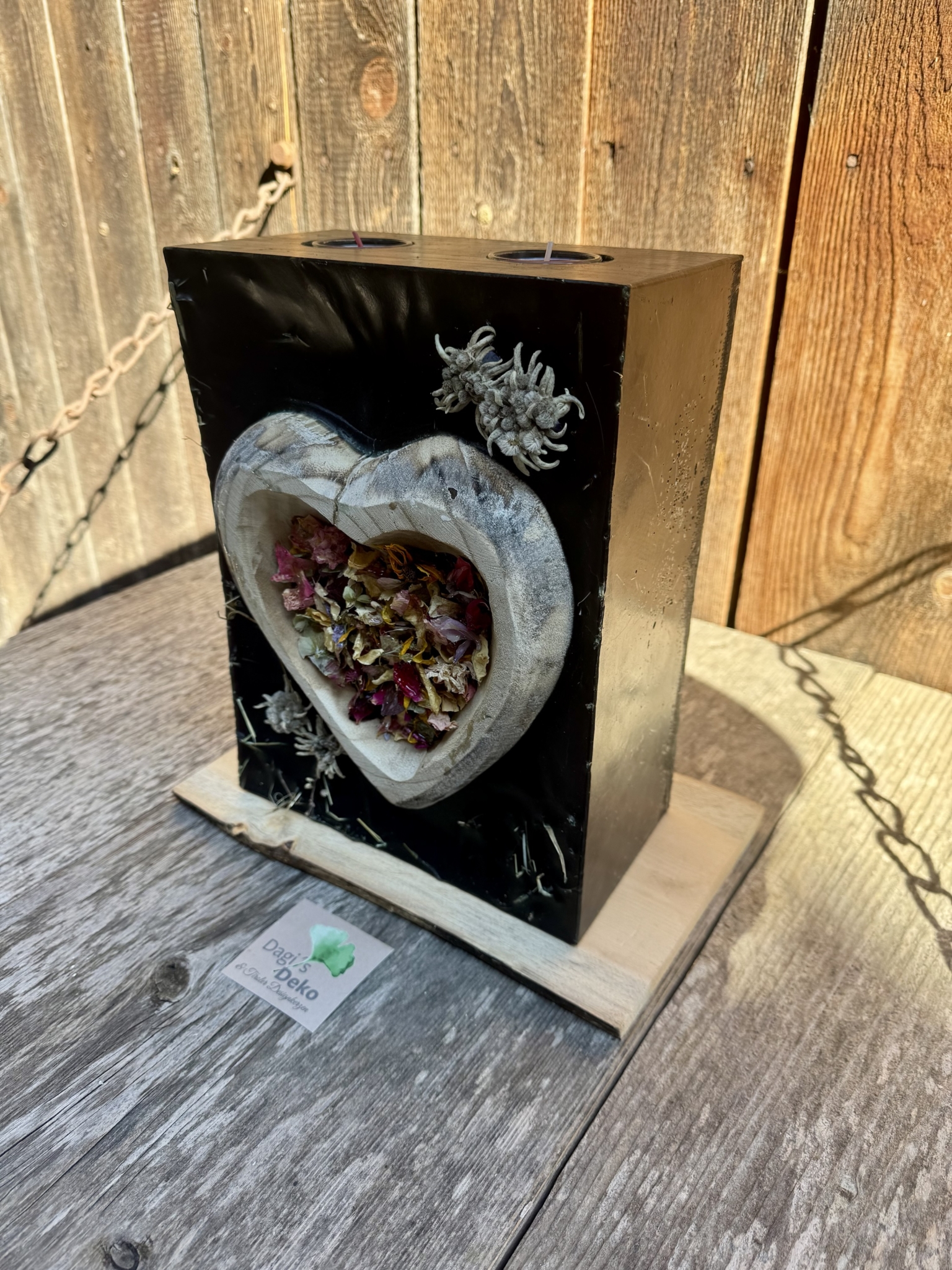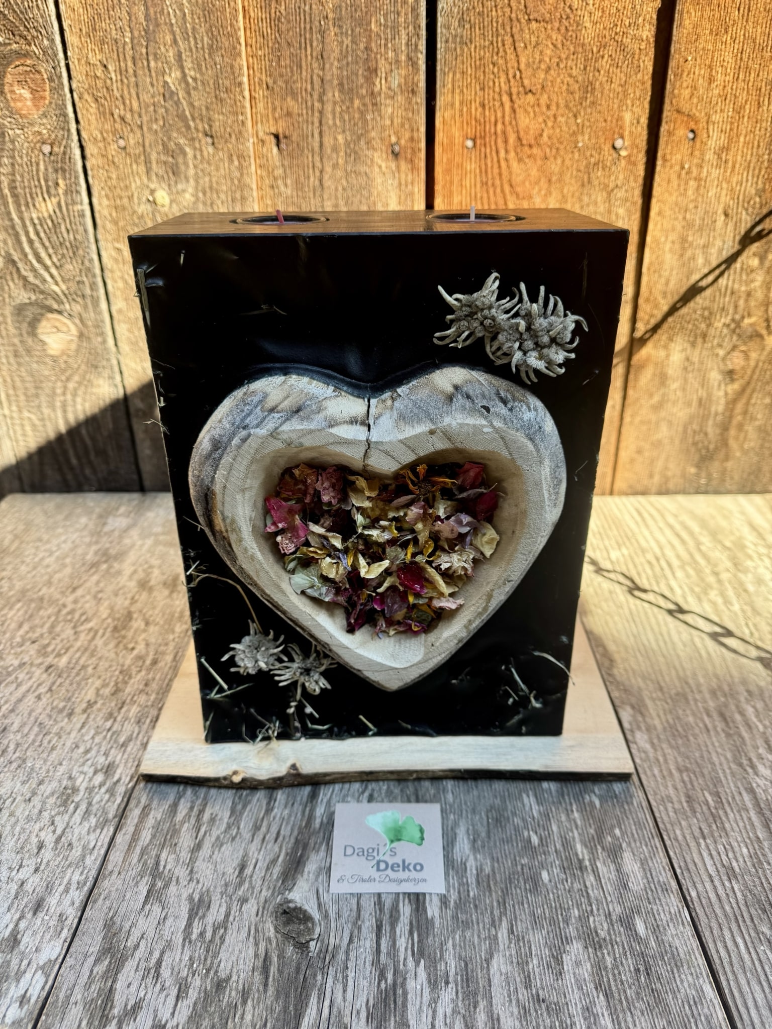 In das schwarze Wachs der Kerze ist ein Holzherz, sowie Heu eingegossen. In dem Holzherz befinden sich in Harz eingegossene Blüten.