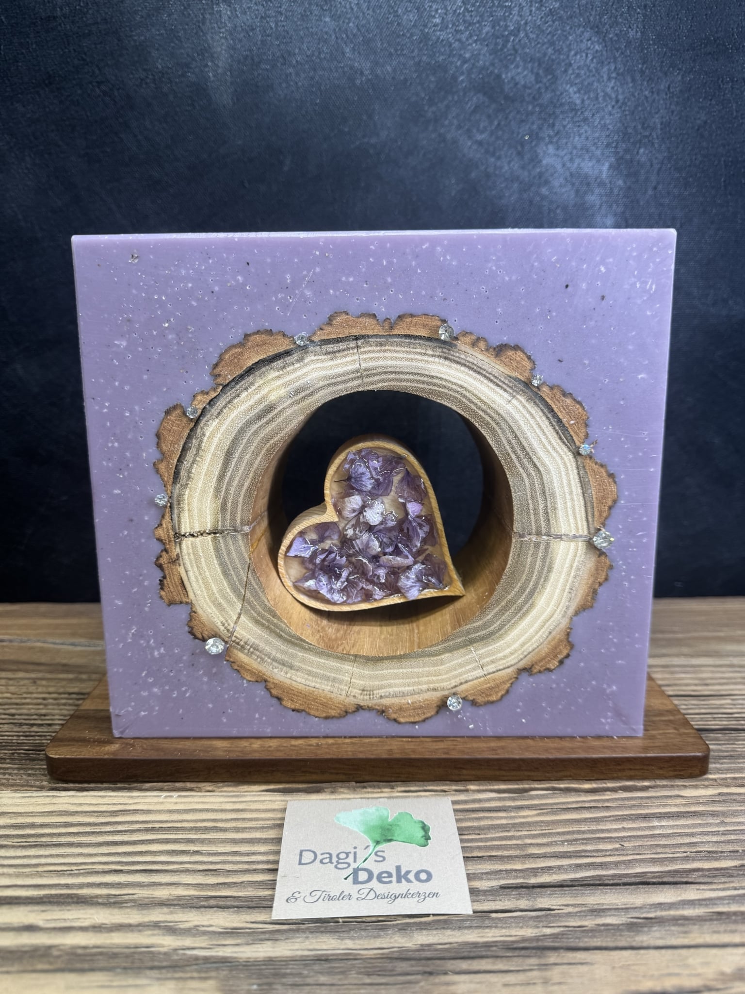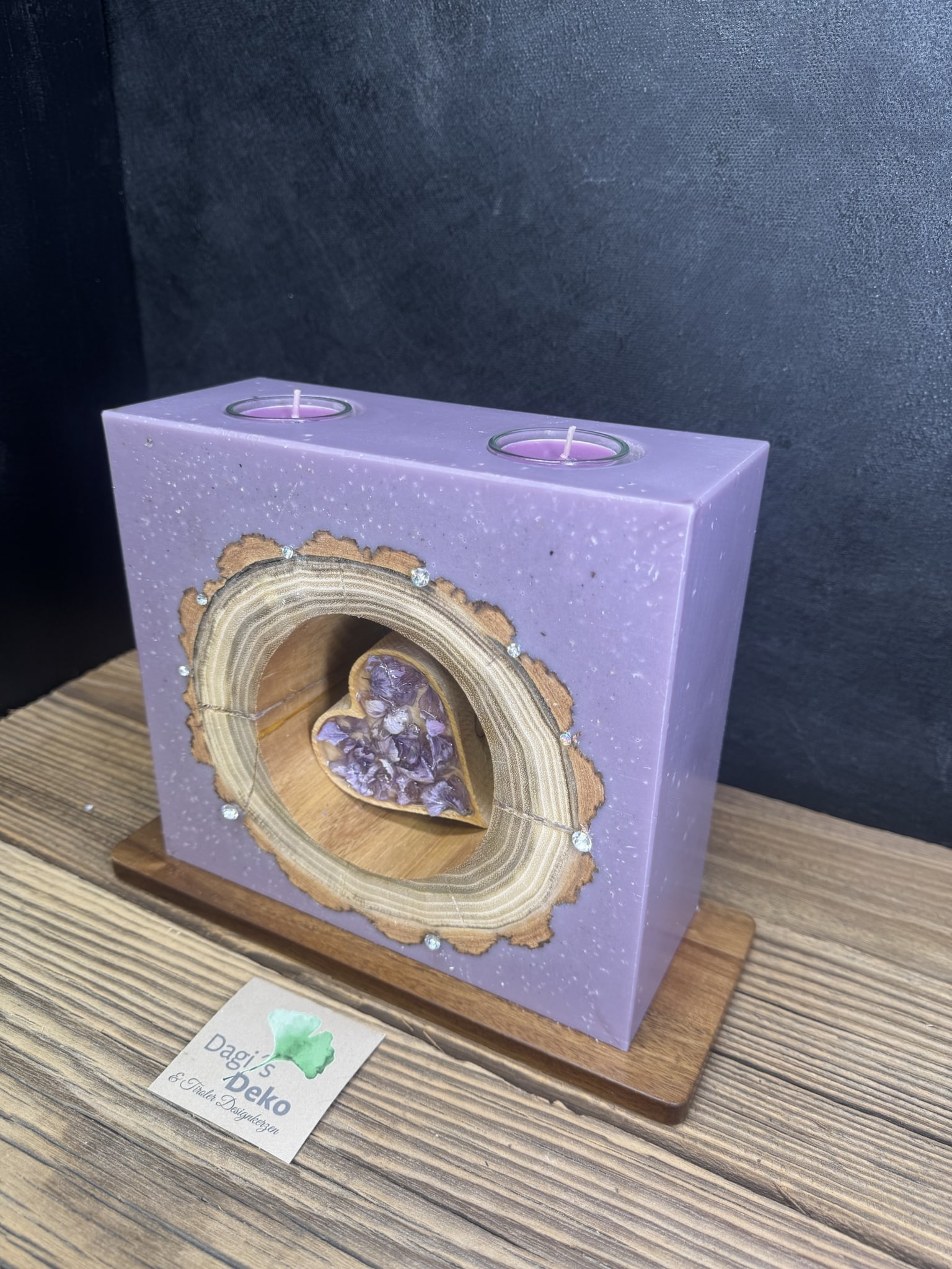 In das violette Wachs der Kerze ist in der Mitte ein Holzkreis mit Hohlraum eingegossen. Zudem befinden sich in der Mitte der Kerze ein Holzherz mit verharzten Blumen und rund um das Holz sind Kristallsteine aufgebracht, ebenfalls auf der Hinterseite.
