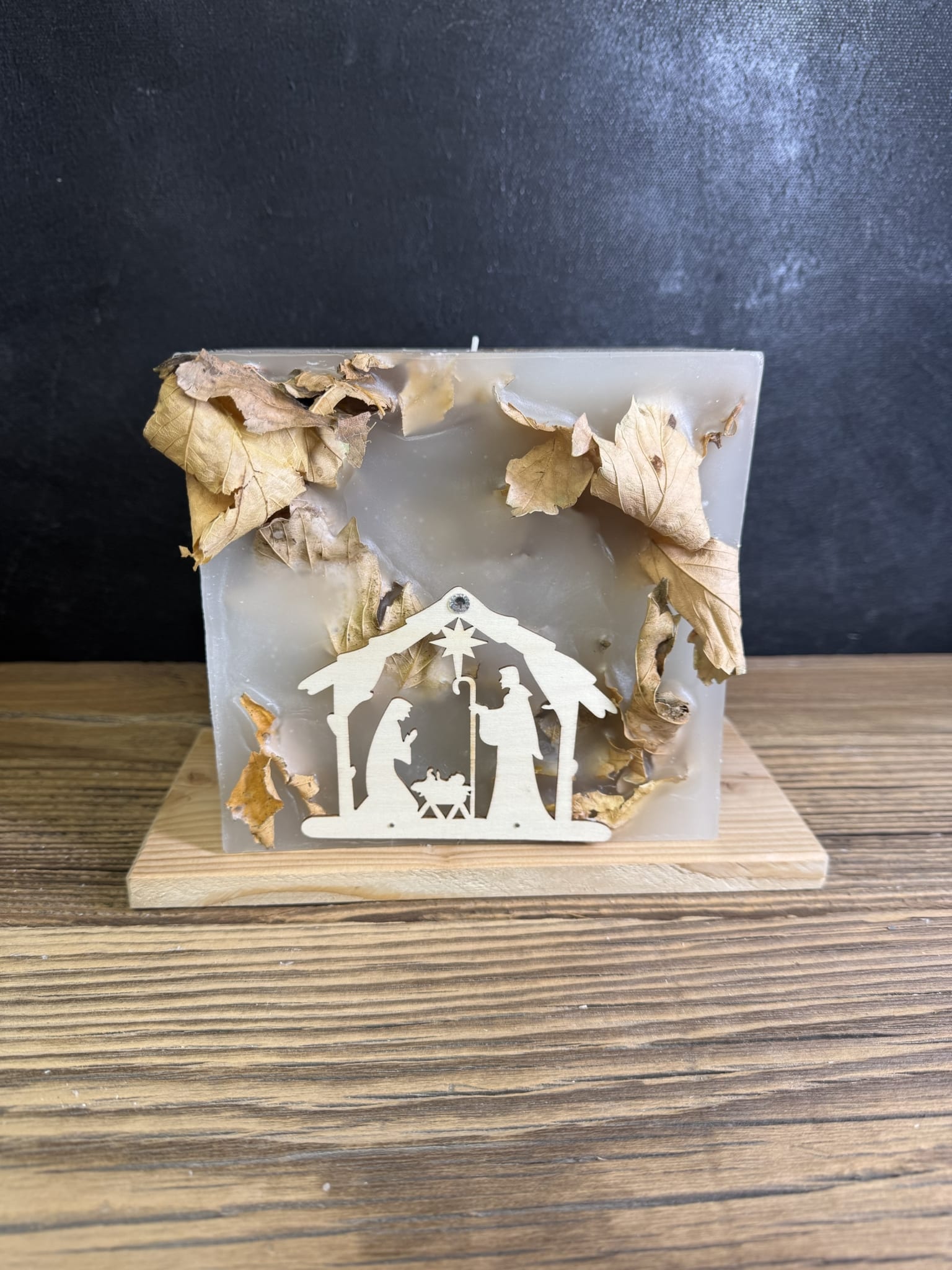 In das grau-beige Wachs der Kerze sind Blätter eingegossen. Zusätzlich befindet sich auf der Kerze ein Holzschild einer Krippe und ein Silber Kristallstein.