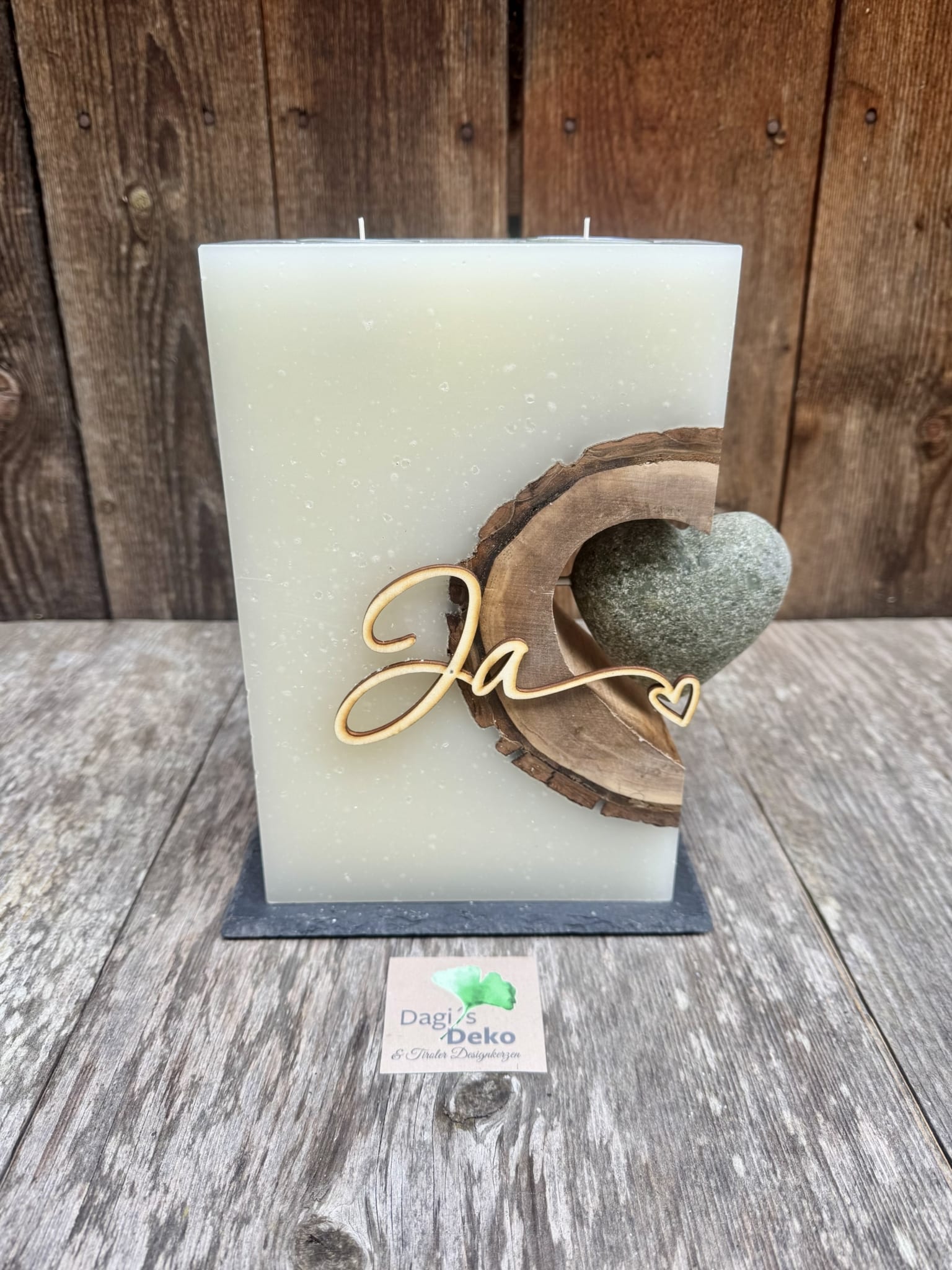 In das creme-weiße Wachs der Kerze ist ein Holz mit herzförmigem Hohlraum eingegossen. An der Seite der Kerze ist ein Steinherz befestigt. Zudem ist in der Mitte ein ausgelasertes „Ja“ aus Holz angebracht.