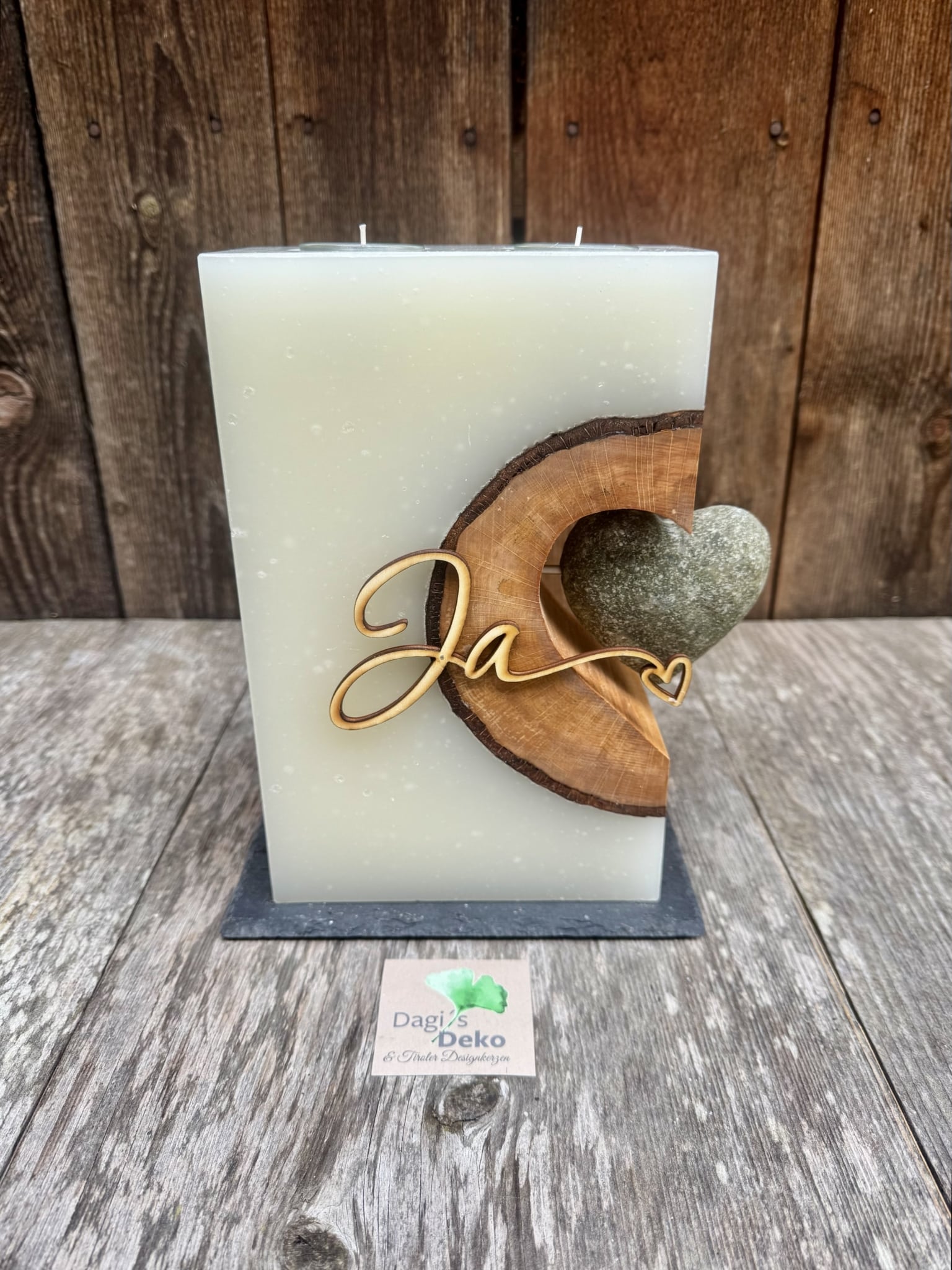 In das creme-weiße Wachs der Kerze ist ein Holz mit herzförmigem Hohlraum eingegossen. An der Seite der Kerze ist ein Steinherz befestigt. Zudem ist in der Mitte ein ausgelasertes „Ja“ aus Holz angebracht.