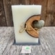 In das grau-weiße Wachs der Kerze ist ein Holz mit herzförmigem Hohlraum eingegossen. An der Seite der Kerze ist ein Steinherz befestigt.