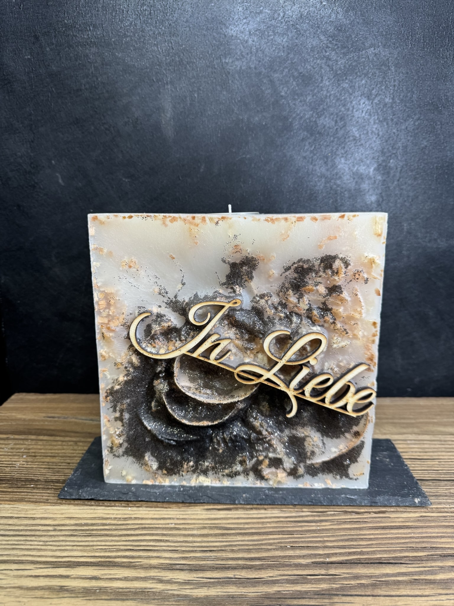 In das creme-weiße Wachs der Kerze sind verschiedene Holzspäne eingegossen. Außerdem ist der Schriftzug „In Liebe“ – aus Holz ausgelasert – eingegossen. Zudem ist die Kerze mit schwarzem Glitzer beschmückt.